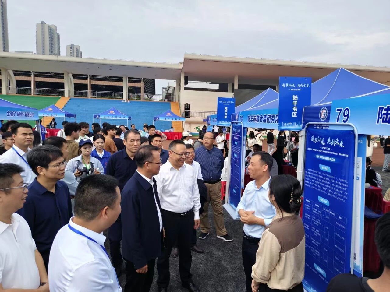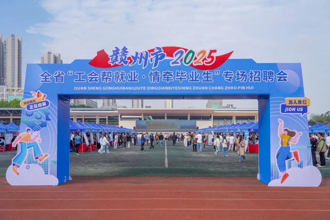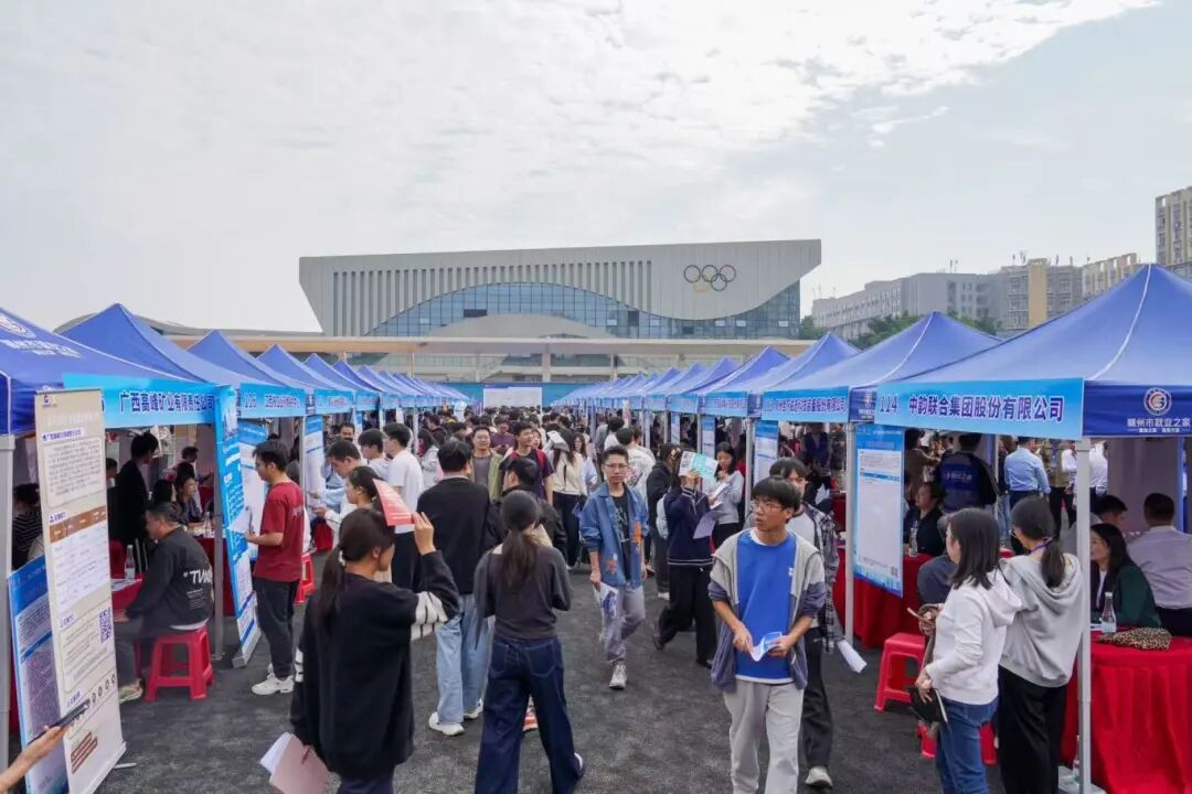 本网讯:10月30日,由江西省总工会主办,赣州市总工会、赣州市人力资源和社会保障局、赣州市教育局、赣南科技学院承办,赣州市人才集团有限公司协办的全省“工会帮就业·情牵毕业生”专场招聘会暨“就”在赣州“虔城”似锦——赣南科技学院2026届毕业生秋季就业洽谈会在学校田径场顺利举办。本次招聘会吸引了来自全国各地的优质企业327家,广东汕尾、浙江遂昌、福建长汀等地人社部门组团来校招聘,提供就业岗位1190个,计划招聘(岗位需求人数)12000余人,招聘范围涵盖资源矿业、机械电气、材料冶金、电子信息、经济管理、文法艺术等多个领域,与学校学科专业设置高度契合。