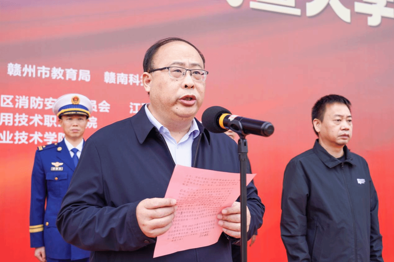 左群代表学校全体师生员工向莅临本次活动的各位领导、嘉宾和消防救援战线的同志们,表示最热烈的欢迎!向长期以来关心支持学校发展和校园消防安全工作的赣州市委、市政府,市消防救援支队及社会各界朋友致以最衷心的感谢!作为培养高素质应用型人才的高校,学校始终秉持“安全为先”的发展理念,将消防安全工作深度融入“明理精工、求是创新”的校训精神实践中。学校坚持推动消防安全工作,建立网格化消防安全工作体系,完善消防安全管理制度,投入专项资金升级智慧消防设施,严格落实消防安全责任。希望通过本次活动,进一步深化校地消防联动机制,让安全理念渗透到校园的每一个角落,共同筑牢校园安全防线。