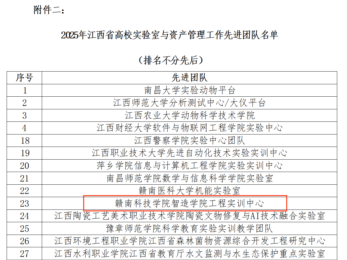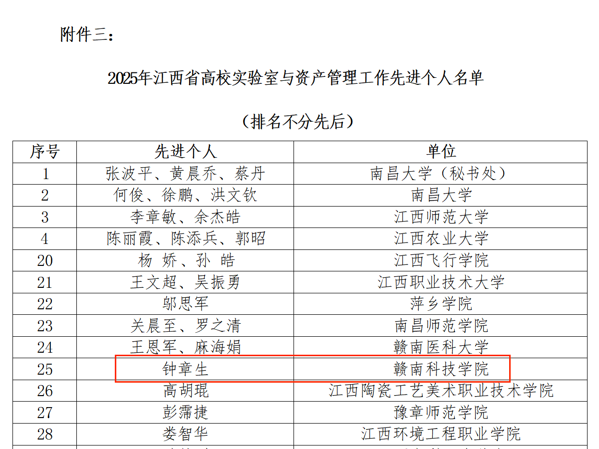本网讯:近日,江西省高等教育学会发布《关于表彰2025年度全省高校实验室工作先进集体和个人的决定》(赣实发〔2025〕4号),我校智能制造与材料工程学院实训中心获评“高校实验室与资产管理工作先进团队”,信息学院钟章生老师荣获“高校实验室与资产管理工作先进个人”称号。