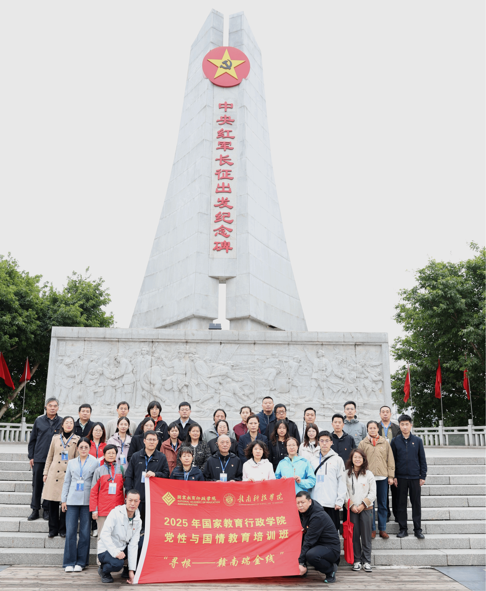 据悉,此次培训于2025年10月19—22日开展,由国家教育行政学院党委副书记、纪委书记李雪明率队参训。培训紧扣“寻根——赣南瑞金线”主题,学员们先后赴瑞金叶坪、沙洲坝、华屋村及于都潭头村、中央红军长征集结出发地纪念园、中央革命根据地历史博物馆等多处红色教育基地,通过专题微党课、现场研学、情景体验等多种形式,引导学员深入赣南这片红色热土,重温峥嵘岁月,锤炼党性修养,强化责任担当。我校马克思主义学院作为主要承办单位,全程周密安排、精心实施,有力保障了培训顺利开展。