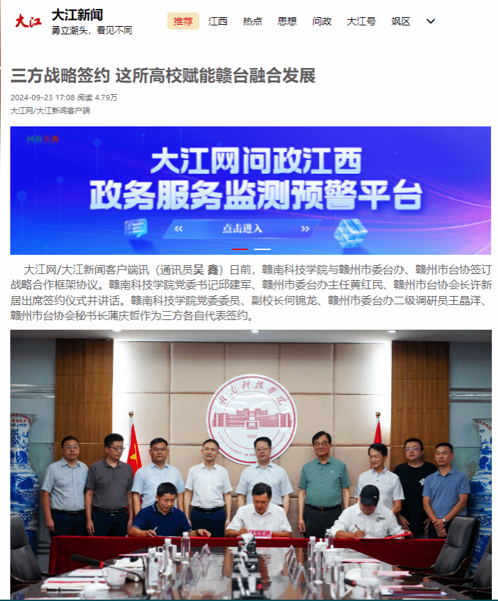大江网/大江新闻客户端讯(通讯员 吴鑫)日前,赣南科技学院与赣州市委台办、赣州市台协签订战略合作框架协议。赣南科技学院党委书记邱建军、赣州市委台办主任黄红民、赣州市台协会长许新居出席签约仪式并讲话。赣南科技学院党委委员、副校长何锦龙、赣州市委台办二级调研员王晶洋、赣州市台协会秘书长蒲庆哲作为三方各自代表签约。