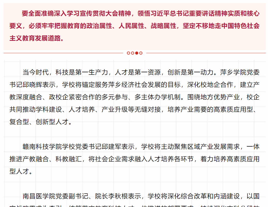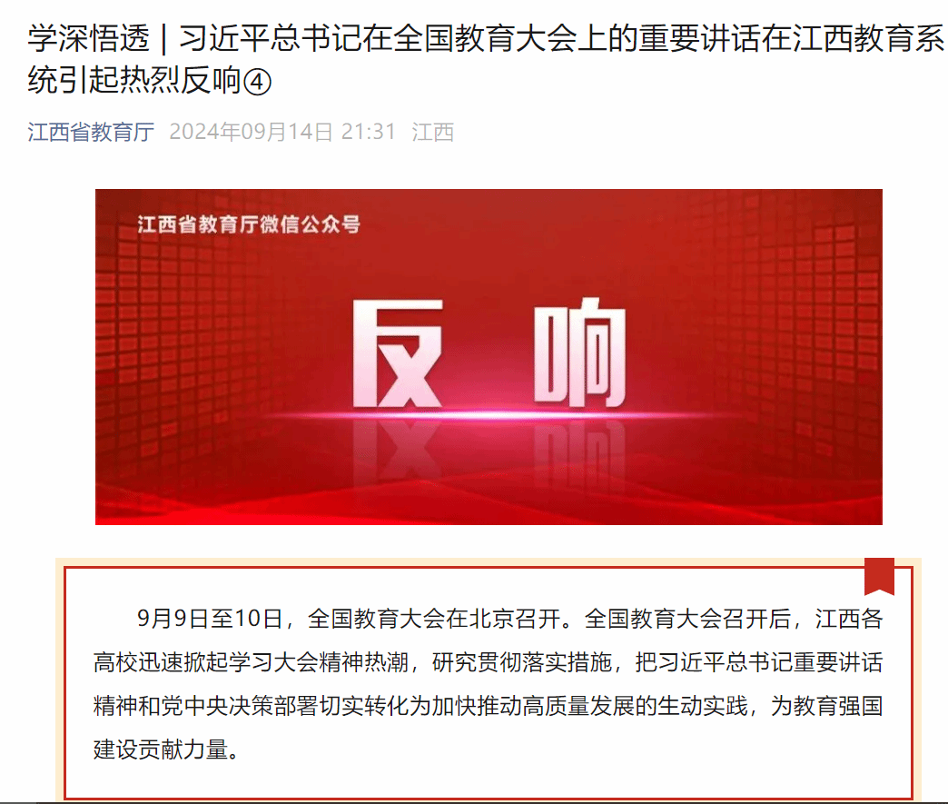 9月9日至10日,全国教育大会在北京召开。全国教育大会召开后,江西各高校迅速掀起学习大会精神热潮,研究贯彻落实措施,把习近平总书记重要讲话精神和党中央决策部署切实转化为加快推动高质量发展的生动实践,为教育强国建设贡献力量。