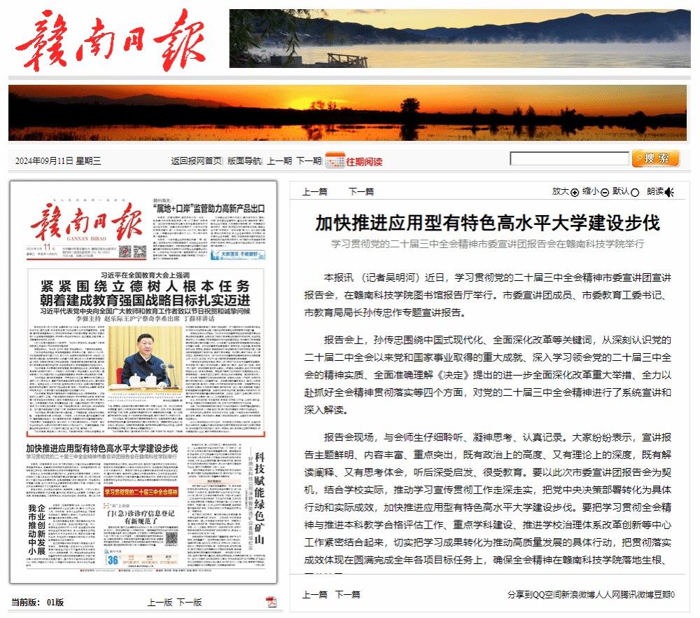 本报讯 (记者吴明河)近日,学习贯彻党的二十届三中全会精神市委宣讲团宣讲报告会,在赣南科技学院图书馆报告厅举行。市委宣讲团成员、市委教育工委书记、市教育局局长孙传忠作专题宣讲报告。