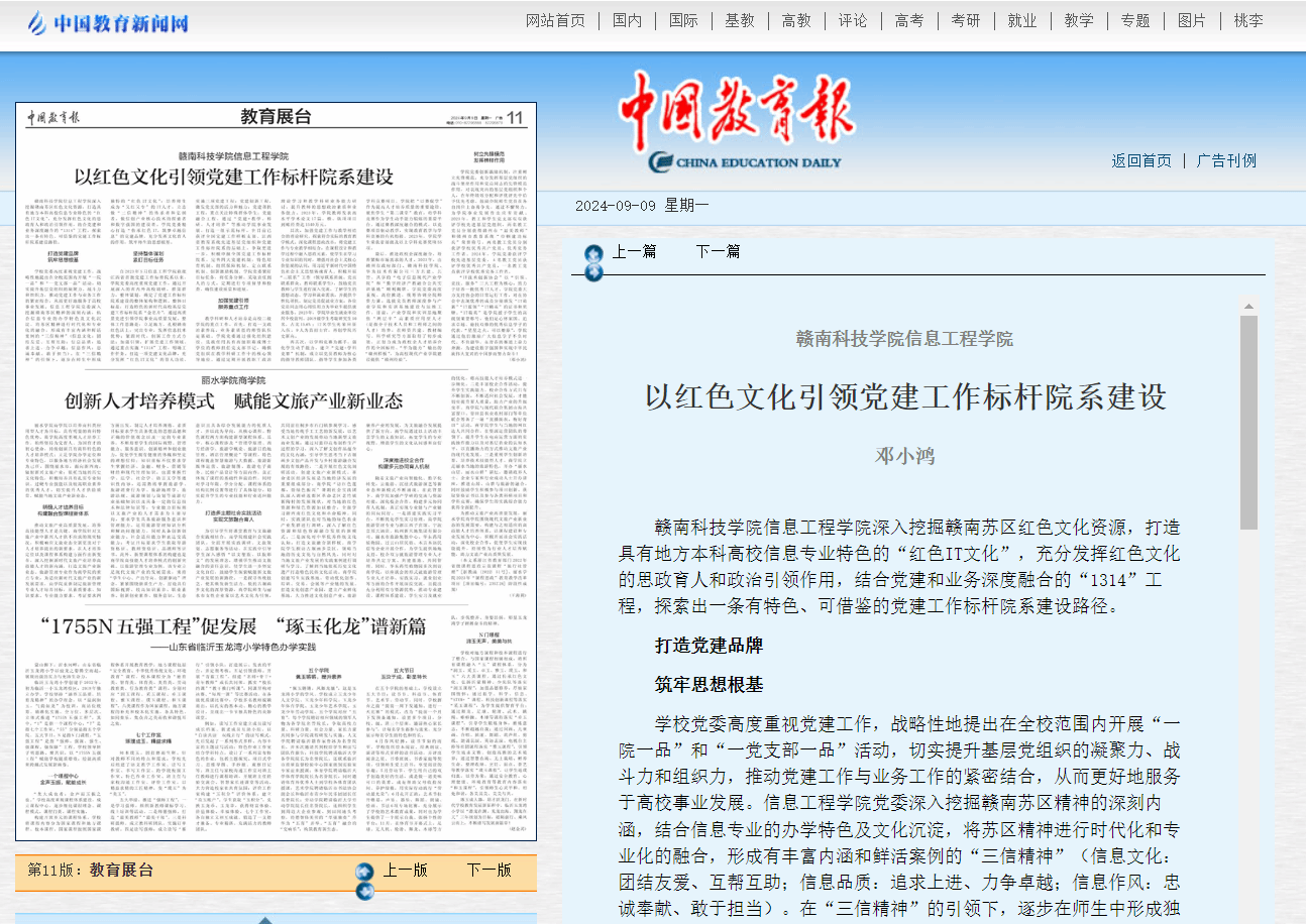 赣南科技学院信息工程学院深入挖掘赣南苏区红色文化资源,打造具有地方本科高校信息专业特色的“红色IT文化”,充分发挥红色文化的思政育人和政治引领作用,结合党建和业务深度融合的“1314”工程,探索出一条有特色、可借鉴的党建工作标杆院系建设路径。