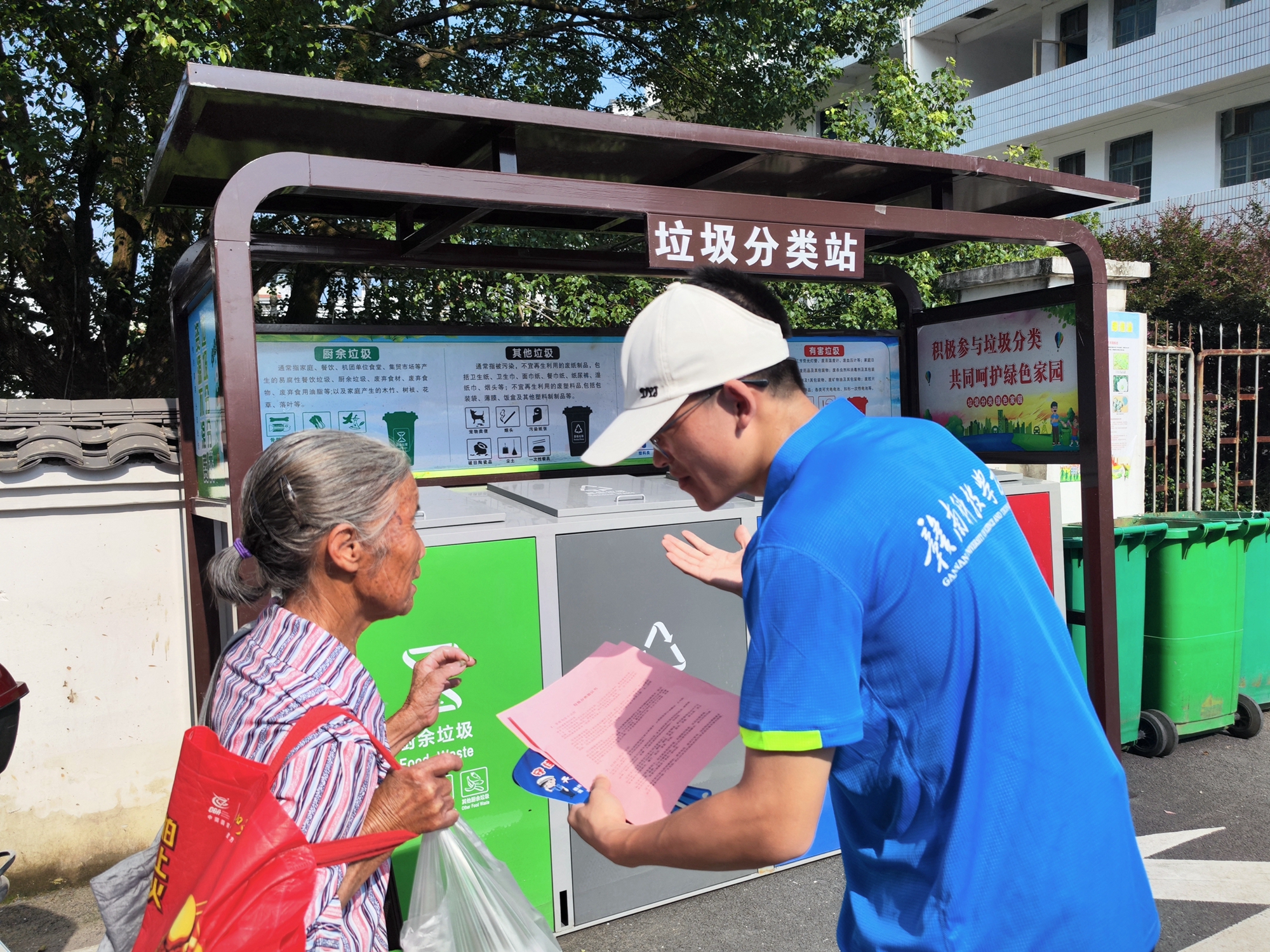 图为实践队队员向老人讲解如何进行垃圾分类及其重要性。中国青年网通讯员 黄宇峰 摄