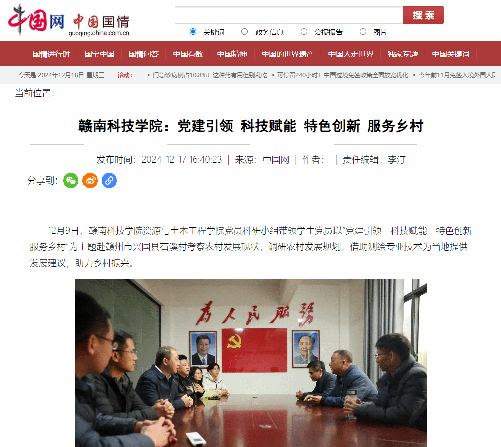 12月9日,赣南科技学院资源与土木工程学院党员科研小组带领学生党员以“党建引领 科技赋能 特色创新 服务乡村”为主题赴赣州市兴国县石溪村考察农村发展现状,调研农村发展规划,借助测绘专业技术为当地提供发展建议,助力乡村振兴。