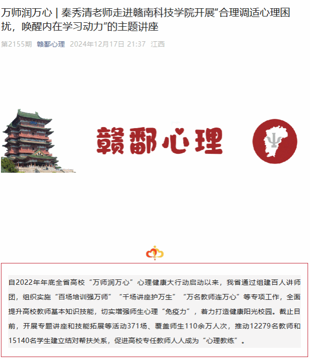 自2022年年底全省高校“万师润万心”心理健康大行动启动以来,我省通过组建百人讲师团,组织实施“百场培训强万师”“千场讲座护万生”“万名教师连万心”等专项工作,全面提升高校教师基本知识技能,切实增强师生心理“免疫力”,着力打造健康阳光校园。截止目前,开展专题讲座和技能拓展等活动371场、覆盖师生110余万人次,推动12279名教师和15140名学生建立结对帮扶关系,促进高校专任教师人人成为“心理教练”。