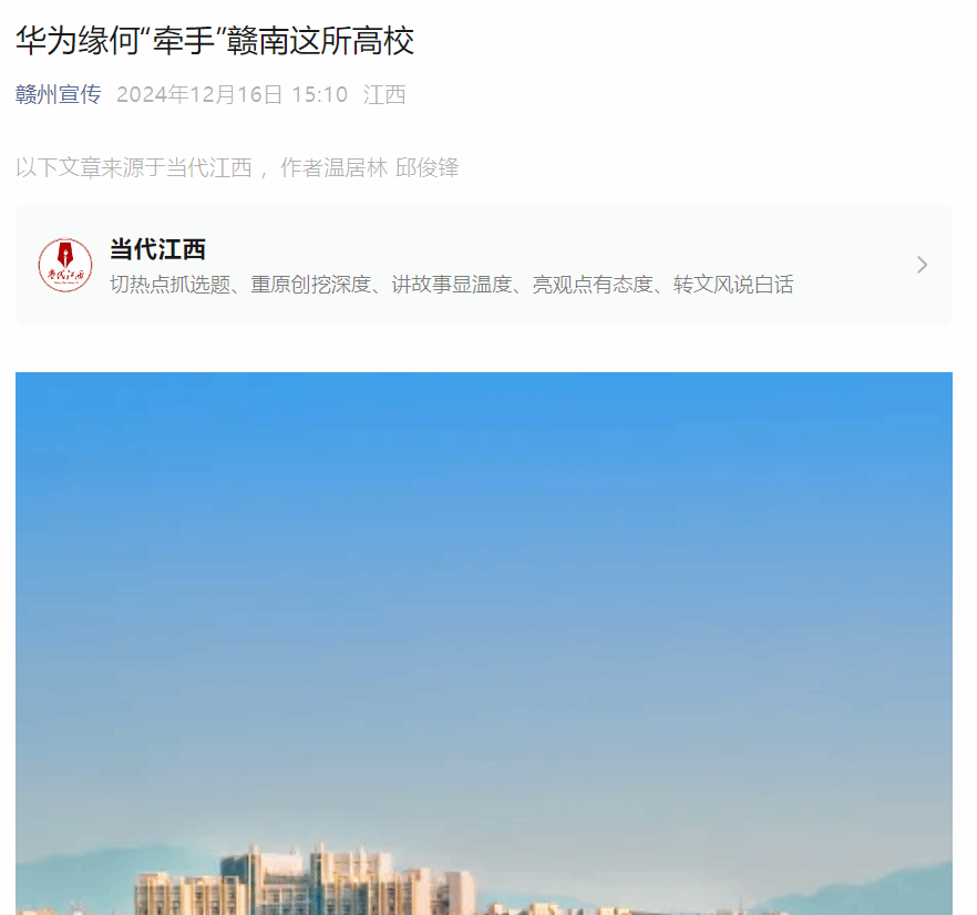 2023年7月,赣州市人民政府、华为技术有限公司与赣南科技学院正式签订三方合作协议,构建由赣州市人民政府给予资金及政策支持,华为技术有限公司资源和能力全面导入,赣南科技学院落地实施的合作模式。10月,三方合作共建的电子信息现代产业学院和数字经济产教融合公共实训基地揭牌,正式开启“两层半”人才培养。