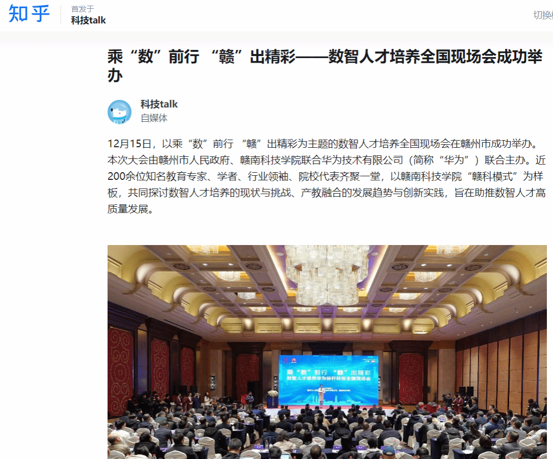 以乘“数”前行 “赣”出精彩为主题的数智人才培养全国现场会在赣州市成功举办。本次大会由赣州市人民政府、赣南科技学院联合华为技术有限公司(简称“华为”)联合主办。近200余位知名教育专家、学者、行业领袖、院校代表齐聚一堂,以赣南科技学院“赣科模式”为样板,共同探讨数智人才培养的现状与挑战、产教融合的发展趋势与创新实践,旨在助推数智人才高质量发展。