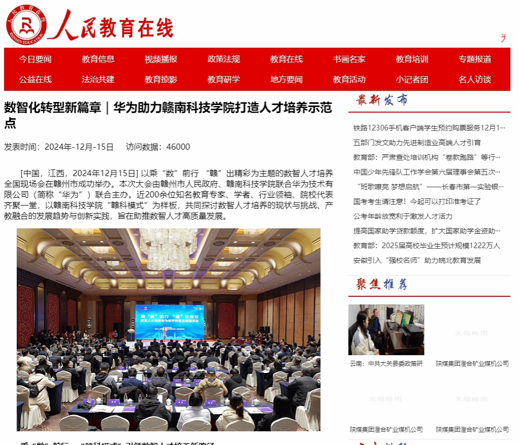 [中国,江西,2024年12月15日] 以乘“数”前行 “赣”出精彩为主题的数智人才培养全国现场会在赣州市成功举办。本次大会由赣州市人民政府、赣南科技学院联合华为技术有限公司(简称“华为”)联合主办。近200余位知名教育专家、学者、行业领袖、院校代表齐聚一堂,以赣南科技学院“赣科模式”为样板,共同探讨数智人才培养的现状与挑战、产教融合的发展趋势与创新实践,旨在助推数智人才高质量发展。