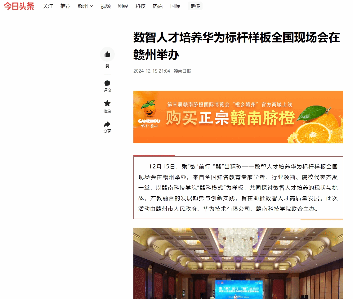 12月15日,乘“数”前行 “赣”出精彩——数智人才培养华为标杆样板全国现场会在赣州举办。来自全国知名教育专家学者、行业领袖、院校代表齐聚一堂,以赣南科技学院“赣科模式”为样板,共同探讨数智人才培养的现状与挑战,产教融合的发展趋势与创新实践,旨在助推数智人才高质量发展。此次活动由赣州市人民政府、华为技术有限公司、赣南科技学院联合主办。