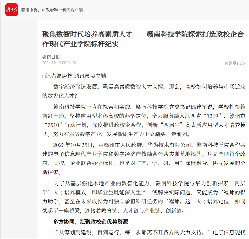 2023年10月25日,由赣州市人民政府、华为技术有限公司、赣南科技学院合作共建的电子信息现代产业学院和数字经济产教融合公共实训基地揭牌。这是全国首个政府、高校、企业联合办学标杆,也是对“产、学、研、用”深度融合、协同发展的全新探索。