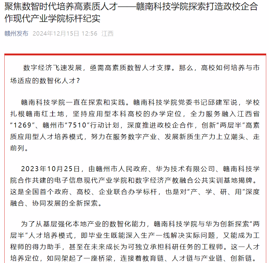 2023年10月25日,由赣州市人民政府、华为技术有限公司、赣南科技学院合作共建的电子信息现代产业学院和数字经济产教融合公共实训基地揭牌。这是全国首个政府、高校、企业联合办学标杆,也是对“产、学、研、用”深度融合、协同发展的全新探索。