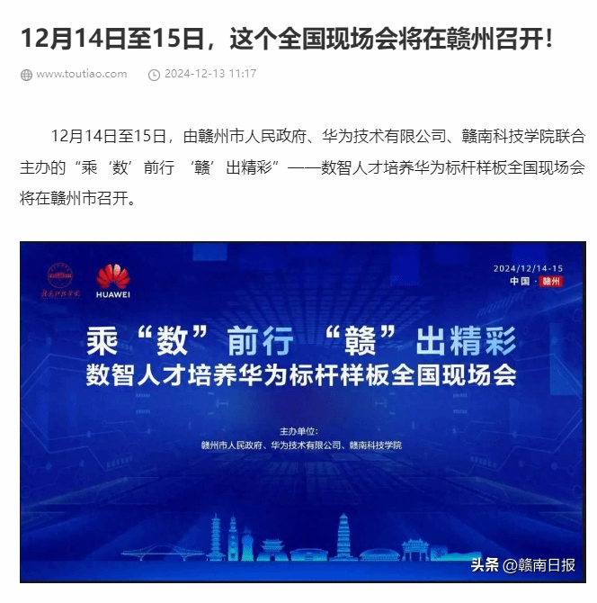 12月14日至15日,由赣州市人民政府、华为技术有限公司、赣南科技学院联合主办的“乘‘数’前行 ‘赣’出精彩”——数智人才培养华为标杆样板全国现场会将在赣州市召开。