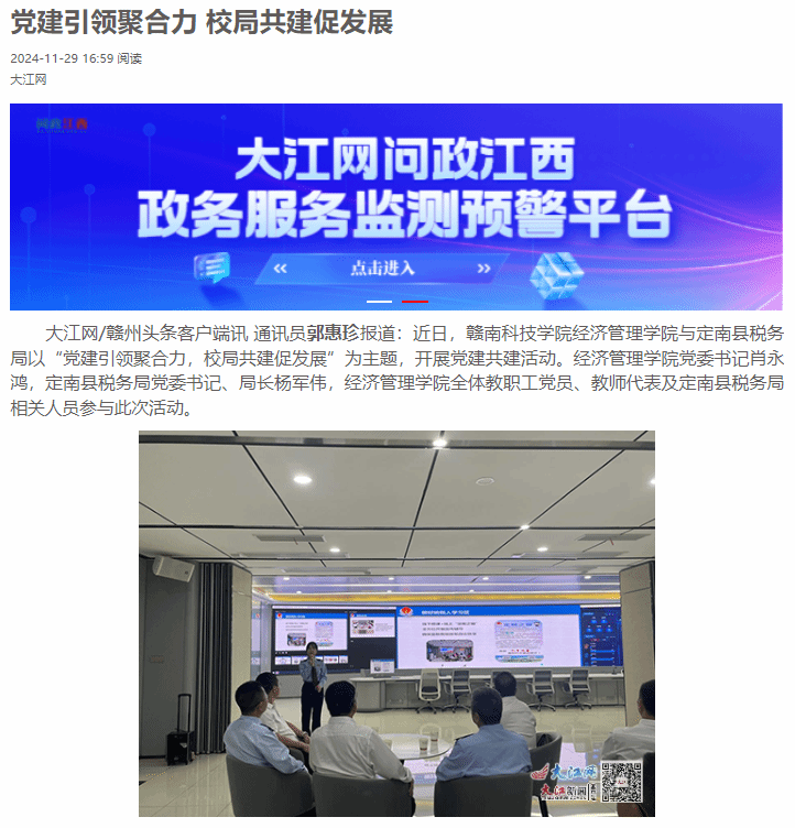 近日,赣南科技学院经济管理学院与定南县税务局以“党建引领聚合力,校局共建促发展”为主题,开展党建共建活动。经济管理学院党委书记肖永鸿,定南县税务局党委书记、局长杨军伟,经济管理学院全体教职工党员、教师代表及定南县税务局相关人员参与此次活动。