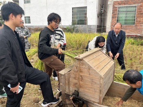 同学们踏入稻田挥镰割稻。割稻、递禾把子、使用打稻机脱粒、桶里掏谷,同学们分工作业,于辛勤劳作中体悟农民艰辛,切实增强珍惜粮食的意识。