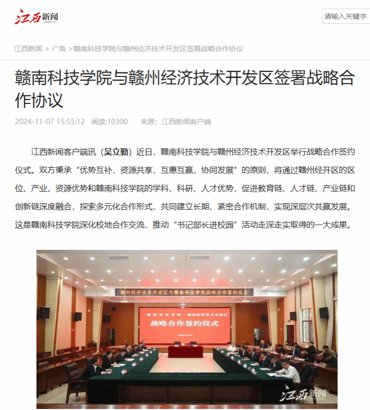 江西新闻客户端讯(吴立勤)近日,赣南科技学院与赣州经济技术开发区举行战略合作签约仪式。双方秉承“优势互补,资源共享,互惠互赢,协同发展”的原则,将通过赣州经开区的区位、产业、资源优势和赣南科技学院的学科、科研、人才优势,促进教育链、人才链、产业链和创新链深度融合,探索多元化合作形式,共同建立长期、紧密合作机制,实现深层次共赢发展。这是赣南科技学院深化校地合作交流,推动“书记部长进校园”活动走深走实取得的一大成果。