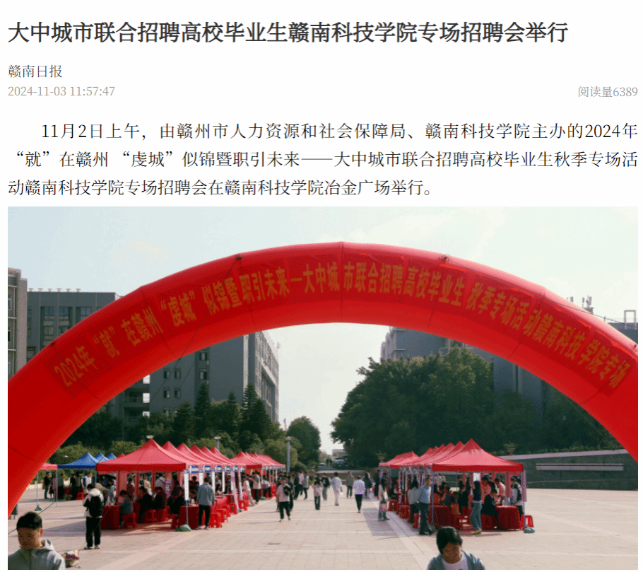 11月2日上午,由赣州市人力资源和社会保障局、赣南科技学院主办的2024年“就”在赣州 “虔城”似锦暨职引未来——大中城市联合招聘高校毕业生秋季专场活动赣南科技学院专场招聘会在赣南科技学院冶金广场举行。