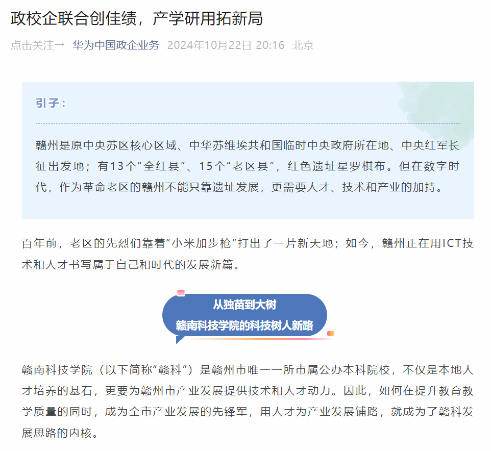 华为与赣科的合作是全国首个政府、高校、企业联合办学标杆,也是对“产、学、研、用”深度融合、协同发展的全新探索。而在与赣州市政府、赣南科技学院深度合作的同时,华为与江西财经职业学院、景德镇艺术职业大学等高校的也在稳步推进。可以说,华为已广泛融入江西的数字化人才发展进程,用技术赋能青春,让教育助力产业。