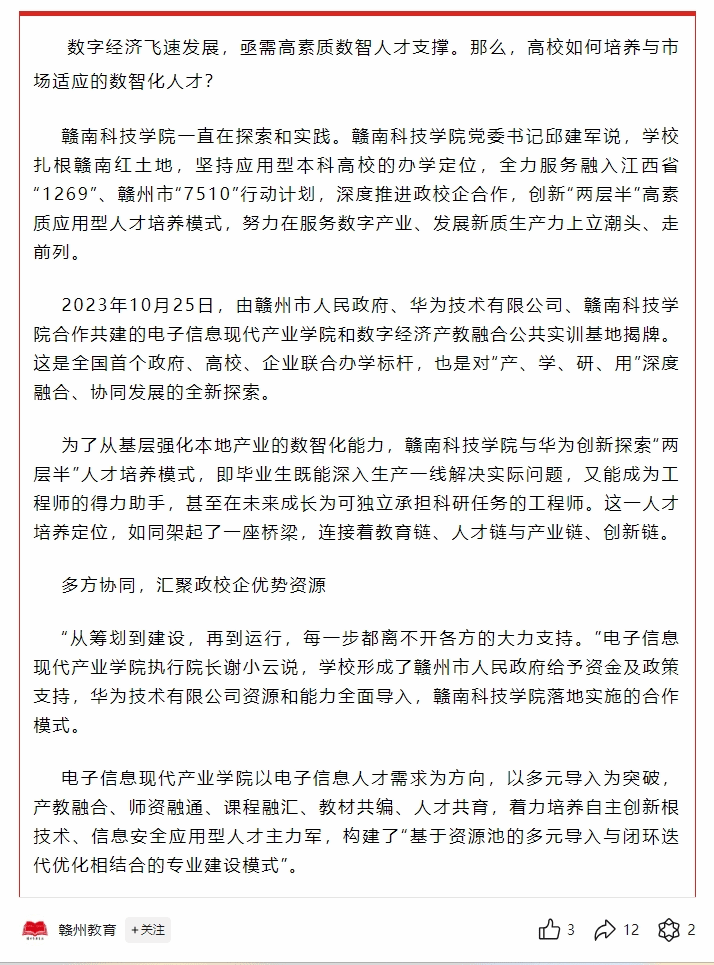 2023年10月25日,由赣州市人民政府、华为技术有限公司、赣南科技学院合作共建的电子信息现代产业学院和数字经济产教融合公共实训基地揭牌。这是全国首个政府、高校、企业联合办学标杆,也是对“产、学、研、用”深度融合、协同发展的全新探索。