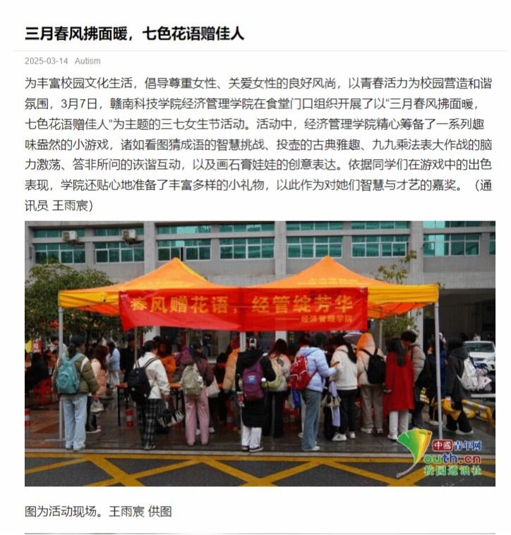 为丰富校园文化生活,倡导尊重女性、关爱女性的良好风尚,以青春活力为校园营造和谐氛围,3月7日,赣南科技学院经济管理学院在食堂门口组织开展了以“三月春风拂面暖,七色花语赠佳人”为主题的三七女生节活动。活动中,经济管理学院精心筹备了一系列趣味盎然的小游戏,诸如看图猜成语的智慧挑战、投壶的古典雅趣、九九乘法表大作战的脑力激荡、答非所问的诙谐互动,以及画石膏娃娃的创意表达。依据同学们在游戏中的出色表现,学院还贴心地准备了丰富多样的小礼物,以此作为对她们智慧与才艺的嘉奖。