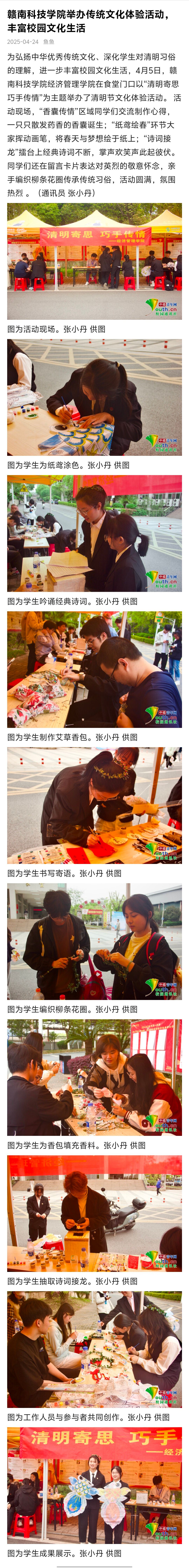 为弘扬中华优秀传统文化、深化学生对清明习俗的理解,进一步丰富校园文化生活,4月5日,赣南科技学院经济管理学院在食堂门口以“清明寄思 巧手传情”为主题举办了清明节文化体验活动。 活动现场,“香囊传情”区域同学们交流制作心得,一只只散发药香的香囊诞生;“纸鸢绘春”环节大家挥动画笔,将春天与梦想绘于纸上;“诗词接龙”擂台上经典诗词不断,掌声欢笑声此起彼伏。同学们还在留言卡片表达对英烈的敬意怀念,亲手编织柳条花圈传承传统习俗,活动圆满,氛围热烈 。(通讯员 张小丹)