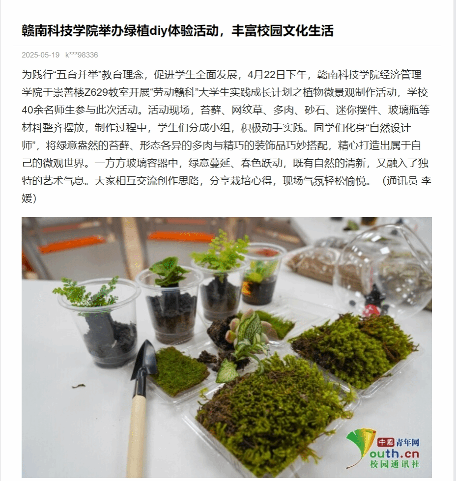 为践行“五育并举”教育理念,促进学生全面发展,4月22日下午,赣南科技学院经济管理学院于崇善楼Z629教室开展“劳动赣科”大学生实践成长计划之植物微景观制作活动,学校40余名师生参与此次活动。活动现场,苔藓、网纹草、多肉、砂石、迷你摆件、玻璃瓶等材料整齐摆放,制作过程中,学生们分成小组,积极动手实践。同学们化身“自然设计师”,将绿意盎然的苔藓、形态各异的多肉与精巧的装饰品巧妙搭配,精心打造出属于自己的微观世界。一方方玻璃容器中,绿意蔓延、春色跃动,既有自然的清新,又融入了独特的艺术气息。大家相互交流创作思路,分享栽培心得,现场气氛轻松愉悦。(通讯员 李媛)