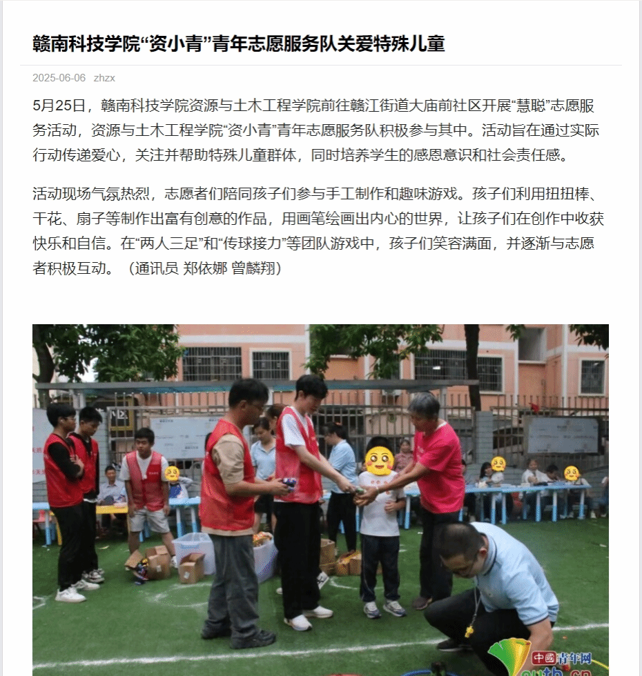 5月25日,赣南科技学院资源与土木工程学院前往赣江街道大庙前社区开展“慧聪”志愿服务活动,资源与土木工程学院“资小青”青年志愿服务队积极参与其中。活动旨在通过实际行动传递爱心,关注并帮助特殊儿童群体,同时培养学生的感恩意识和社会责任感。