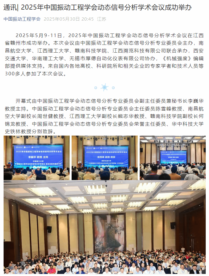 2025年5月9-11日,2025年中国振动工程学会动态信号分析学术会议在江西省赣州市成功举办。本次会议由中国振动工程学会动态信号分析专业委员会主办,南昌航空大学、江西理工大学、赣南科技学院、江西溯览科技有限公司联合承办,西安交通大学、华南理工大学、无锡市厚德自动化仪表有限公司协办,《机械强度》编辑部提供媒体支持。来自国内各地高校、科研院所和相关企业的专家学者和技术人员等300多人参加了本次会议。