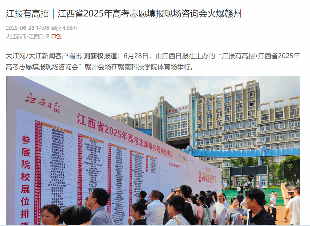 大江网/大江新闻客户端讯 刘新权报道:6月28日,由江西日报社主办的“江报有高招·江西省2025年高考志愿填报现场咨询会”赣州会场在赣南科技学院体育场举行。