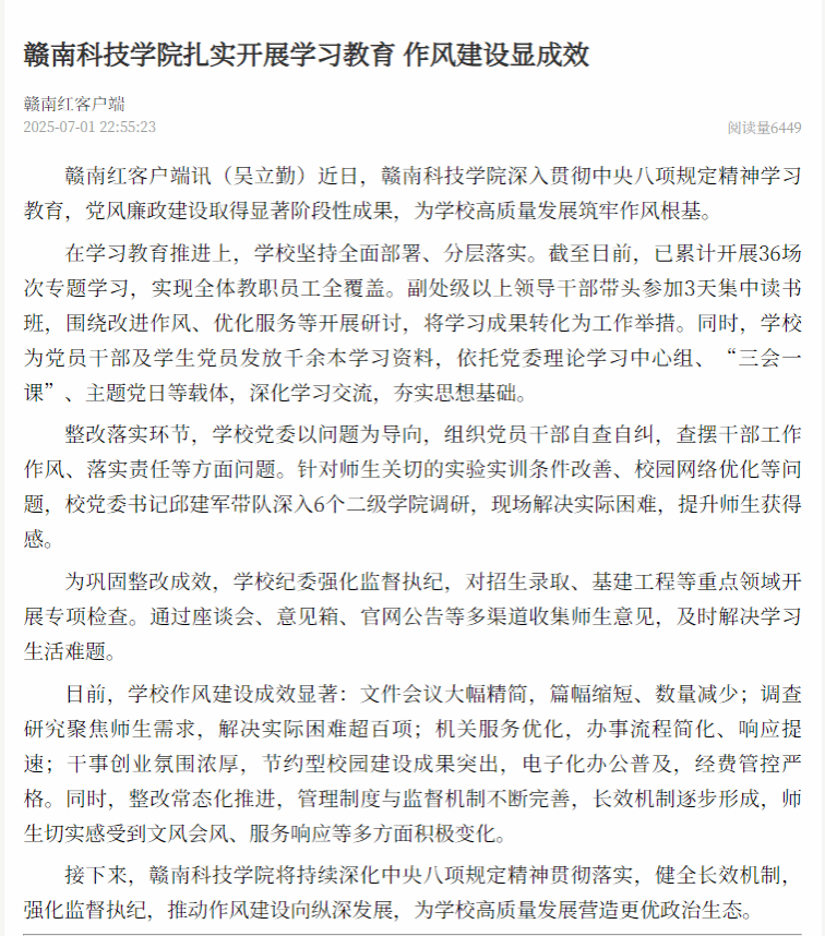 赣南红客户端讯(吴立勤)近日,赣南科技学院深入贯彻中央八项规定精神学习教育,党风廉政建设取得显著阶段性成果,为学校高质量发展筑牢作风根基。