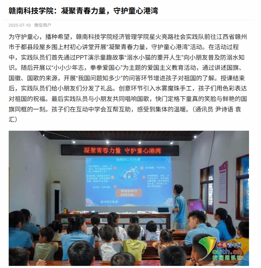 为守护童心,播种希望,赣南科技学院经济管理学院星火亮路社会实践队前往江西省赣州市于都县段屋乡围上村初心讲堂开展“凝聚青春力量,守护童心港湾”活动。在活动过程中,实践队员们首先通过PPT演示童趣故事“溺水小猫的重开人生”向小朋友普及防溺水知识。随后开展以“小小少年志,拳拳爱国心”为主题的爱国主义教育活动,通过讲述国旗、国徽、国歌的来源,开展“我国问题知多少”的问答环节增进孩子对祖国的了解。授课结束后,实践队员们给小朋友们分发了礼品。创意环节引入水雾魔珠手工,孩子们用色彩表达对祖国的祝福。最后实践队员与小朋友共同唱响国歌,快门定格下童真的笑脸与鲜艳的国旗同框的一刻。孩子们在互动中学会互帮互助,感受到集体的温暖。(通讯员 尹诗语 袁汇)