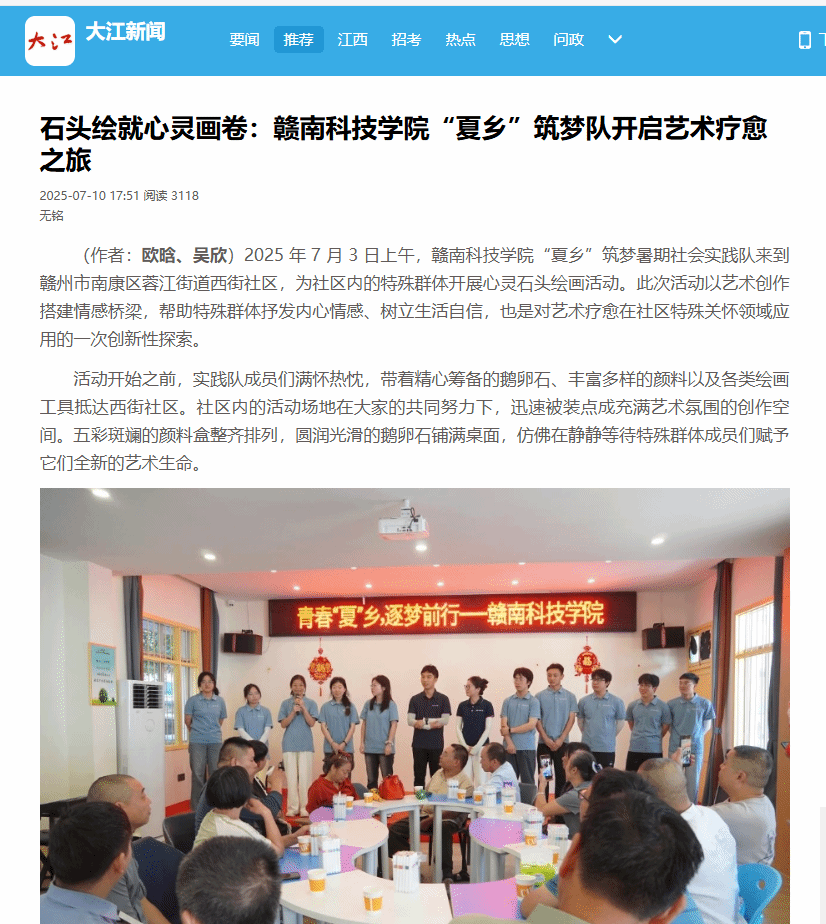 (作者:欧晗、吴欣)2025 年 7 月 3 日上午,赣南科技学院“夏乡”筑梦暑期社会实践队来到赣州市南康区蓉江街道西街社区,为社区内的特殊群体开展心灵石头绘画活动。此次活动以艺术创作搭建情感桥梁,帮助特殊群体抒发内心情感、树立生活自信,也是对艺术疗愈在社区特殊关怀领域应用的一次创新性探索。