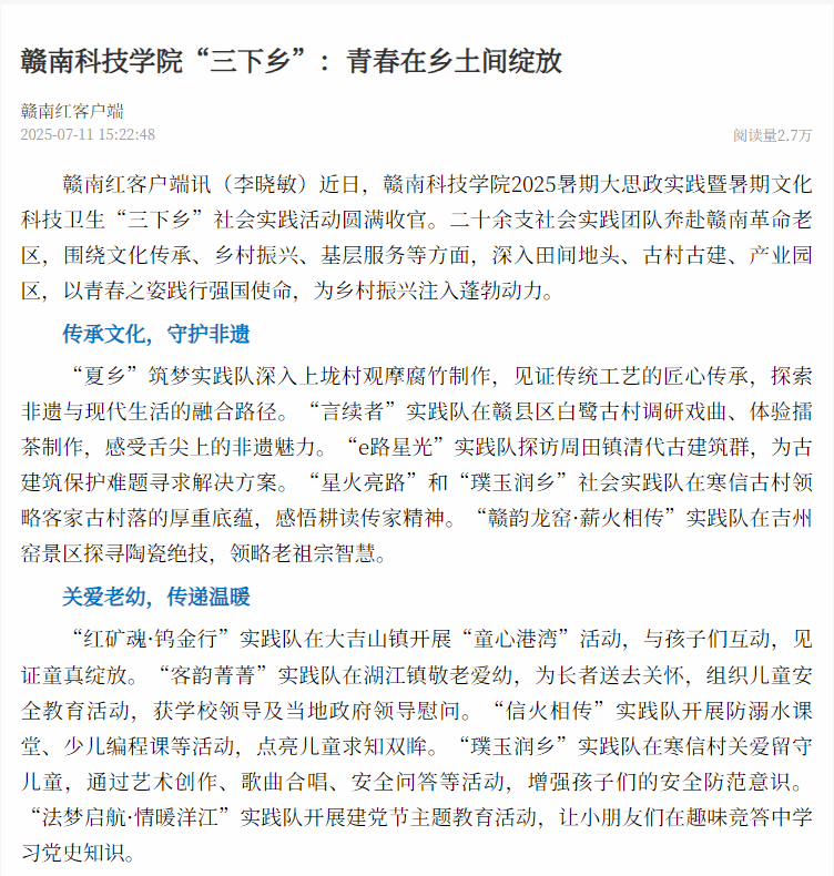 赣南红客户端讯(李晓敏)近日,赣南科技学院2025暑期大思政实践暨暑期文化科技卫生“三下乡”社会实践活动圆满收官。二十余支社会实践团队奔赴赣南革命老区,围绕文化传承、乡村振兴、基层服务等方面,深入田间地头、古村古建、产业园区,以青春之姿践行强国使命,为乡村振兴注入蓬勃动力。