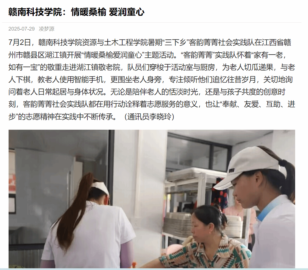 7月2日,赣南科技学院资源与土木工程学院暑期“三下乡”客韵菁菁社会实践队在江西省赣州市赣县区湖江镇开展“情暖桑榆爱润童心”主题活动。“客韵菁菁”实践队怀着“家有一老,如有一宝”的敬重走进湖江镇敬老院,队员们穿梭于活动室与厨房,为老人切瓜递果,与老人下棋,教老人使用智能手机,更围坐老人身旁,专注倾听他们追忆往昔岁月,关切地询问着老人日常起居与身体状况。无论是陪伴老人的恬淡时光,还是与孩子共度的创意时刻,客韵菁菁社会实践队都在用行动诠释着志愿服务的意义,也让“奉献、友爱、互助、进步”的志愿精神在实践中不断传承。(通讯员李晓玲)