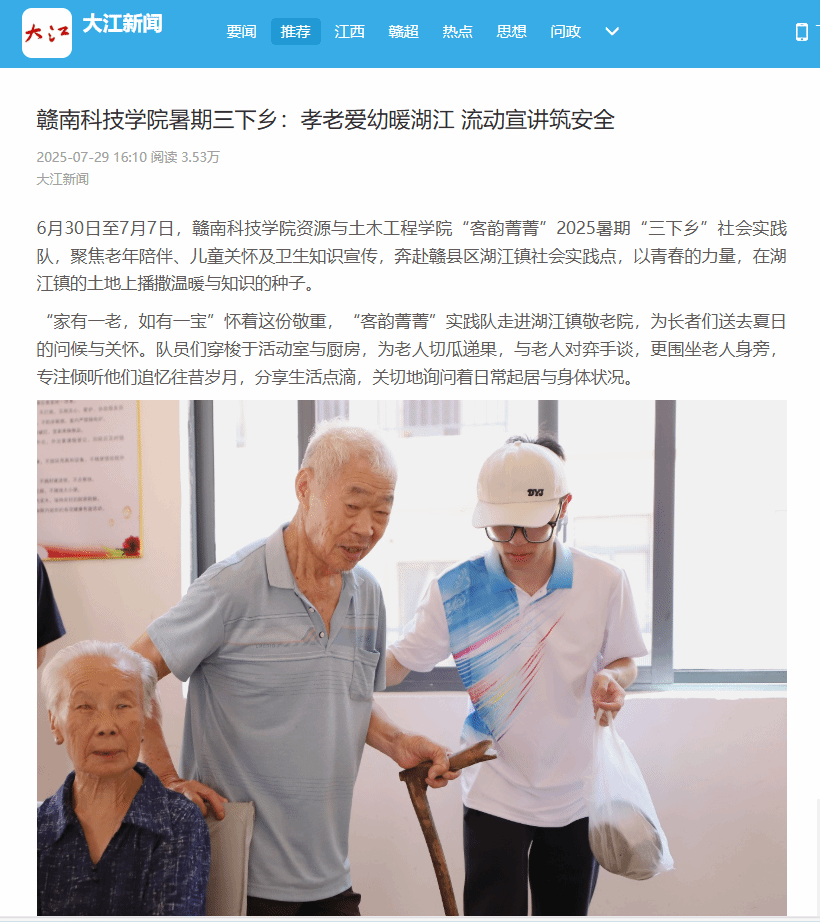 6月30日至7月7日,赣南科技学院资源与土木工程学院“客韵菁菁”2025暑期“三下乡”社会实践队,聚焦老年陪伴、儿童关怀及卫生知识宣传,奔赴赣县区湖江镇社会实践点,以青春的力量,在湖江镇的土地上播撒温暖与知识的种子。