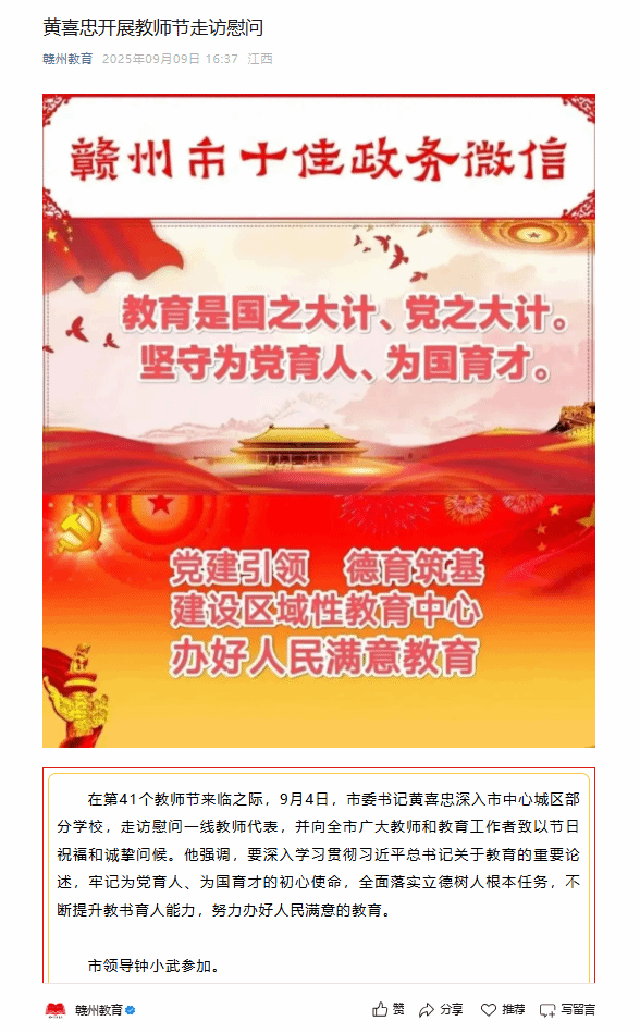在第41个教师节来临之际,9月4日,市委书记黄喜忠深入市中心城区部分学校,走访慰问一线教师代表,并向全市广大教师和教育工作者致以节日祝福和诚挚问候。他强调,要深入学习贯彻习近平总书记关于教育的重要论述,牢记为党育人、为国育才的初心使命,全面落实立德树人根本任务,不断提升教书育人能力,努力办好人民满意的教育。