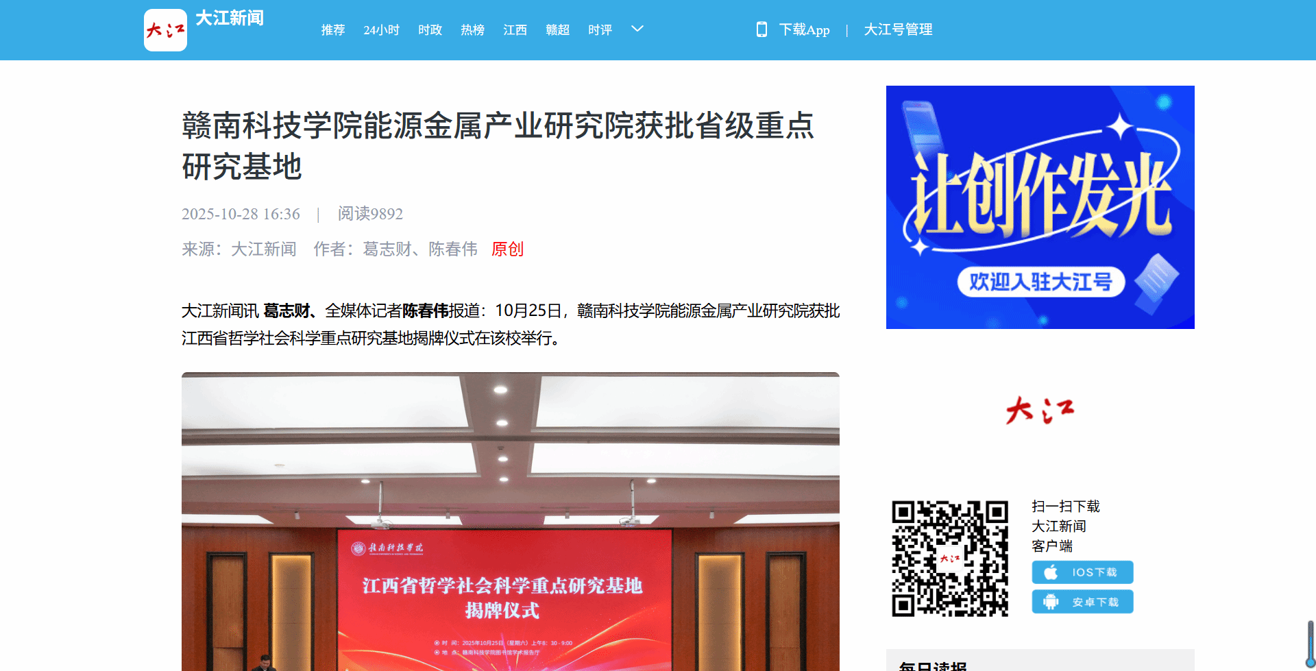 大江新闻讯 葛志财、全媒体记者陈春伟报道:10月25日,赣南科技学院能源金属产业研究院获批江西省哲学社会科学重点研究基地揭牌仪式在该校举行。