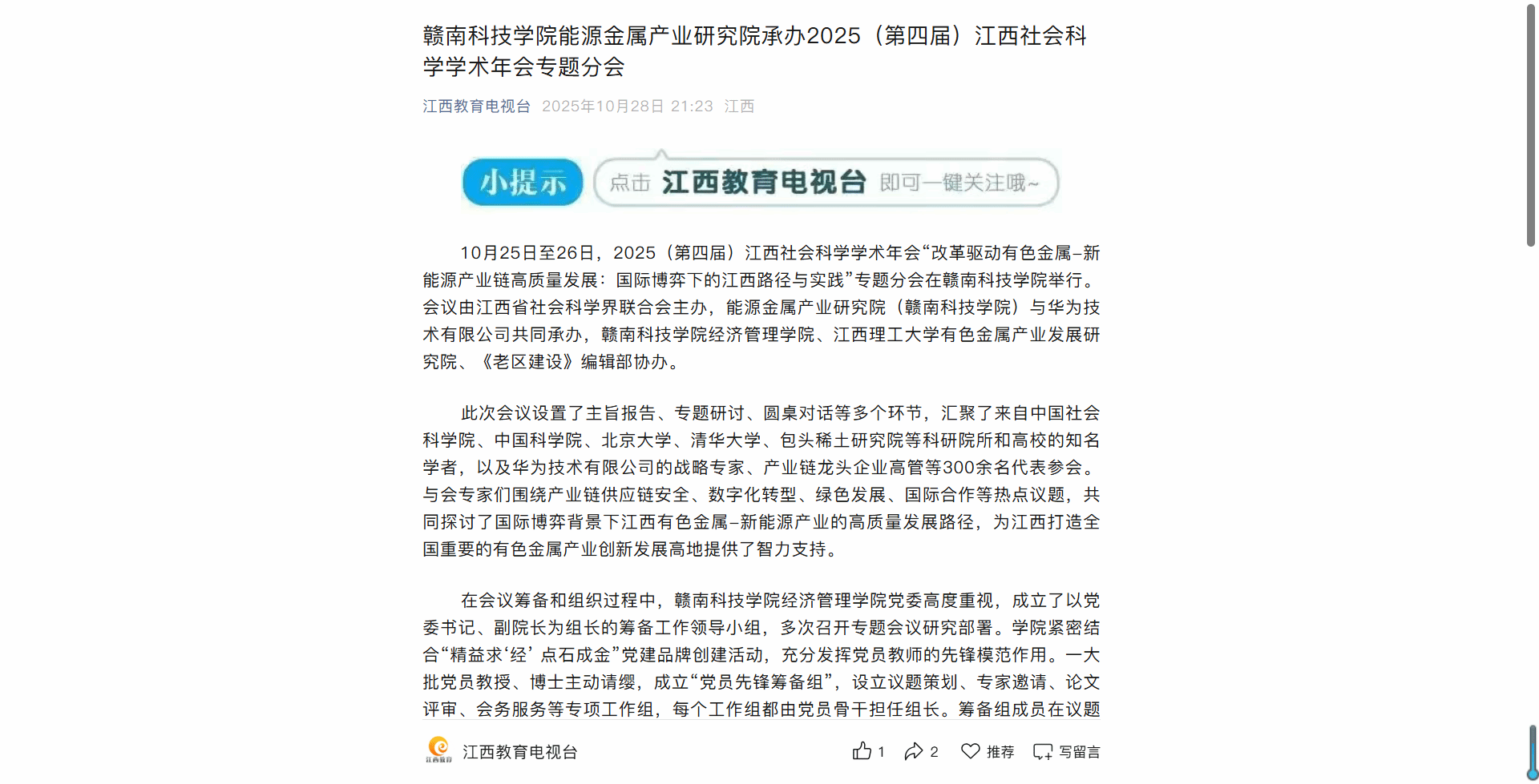 本网讯:10月25日至26日,由江西省社会科学界联合会主办,我校能源金属产业研究院、华为技术有限公司共同承办的2025年(第四届)江西社会科学学术年会“改革驱动有色金属-新能源产业链高质量发展:国际博弈下的江西路径与实践”专题分会在我校成功举办。本次会议恰逢我校能源金属产业研究院获批江西省哲学社会科学重点研究基地举行揭牌仪式,双喜临门,意义非凡。