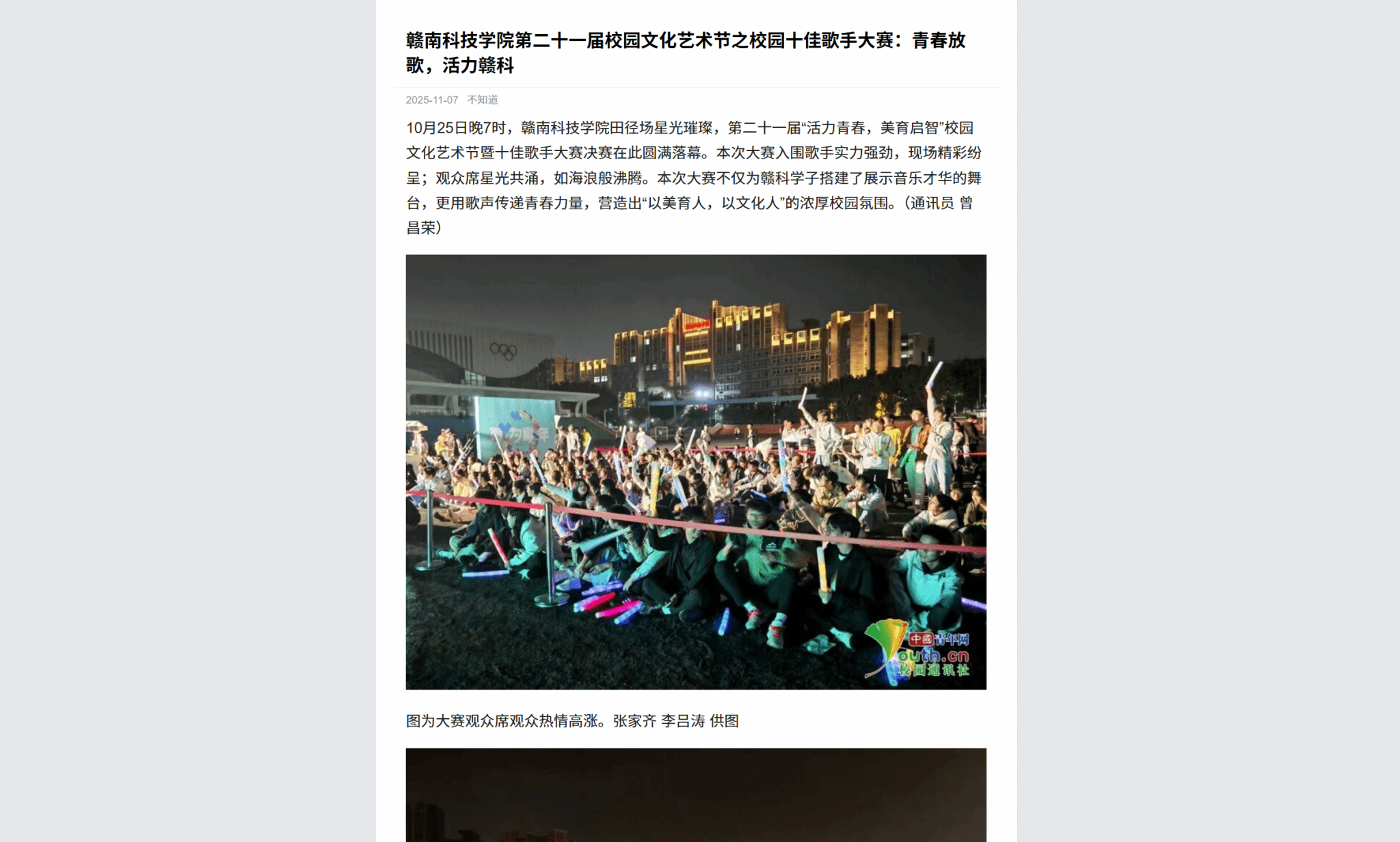 10月25日晚7时,赣南科技学院田径场星光璀璨,第二十一届“活力青春,美育启智”校园文化艺术节暨十佳歌手大赛决赛在此圆满落幕。本次大赛入围歌手实力强劲,现场精彩纷呈;观众席星光共涌,如海浪般沸腾。本次大赛不仅为赣科学子搭建了展示音乐才华的舞台,更用歌声传递青春力量,营造出“以美育人,以文化人”的浓厚校园氛围。(通讯员 曾昌荣)