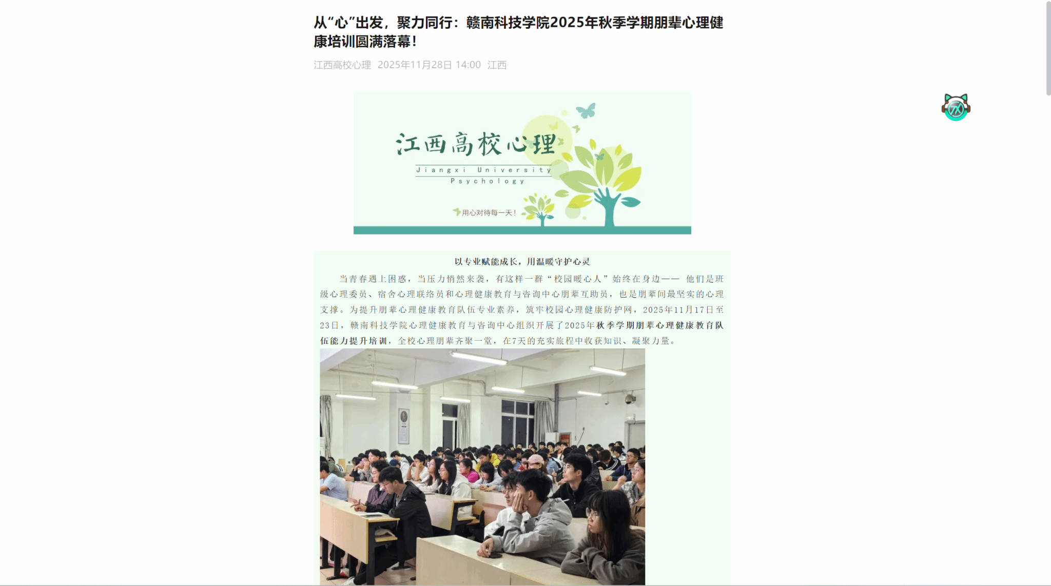 未来,赣南科技学院将持续完善朋辈心理健康教育体系,常态化开展能力提升培训,让每一位朋辈都能成为“专业的倾听者、温暖的陪伴者、科学的转介者”。愿我们以心换心、以爱传爱,共同构筑阳光健康、温暖有爱的校园心理生态,让每一位赣科学子都能在青春路上向阳生长!