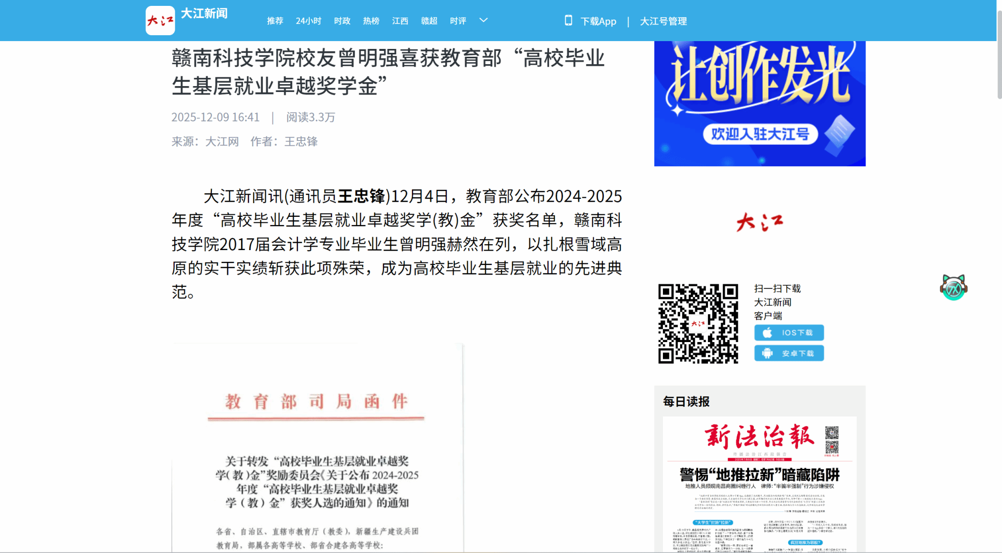 大江新闻讯(通讯员王忠锋)12月4日,教育部公布2024-2025年度“高校毕业生基层就业卓越奖学(教)金”获奖名单,赣南科技学院2017届会计学专业毕业生曾明强赫然在列,以扎根雪域高原的实干实绩斩获此项殊荣,成为高校毕业生基层就业的先进典范。