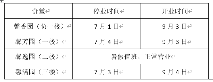 根据暑假工作安排,馨逸园(二楼)食堂承担暑假开伙值班工作,其他食堂开停伙通知详见下表: