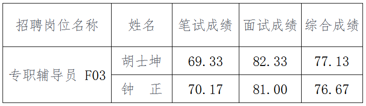 专职辅导员F03岗考生凌煜、肖承军因个人原因放弃入闱资格。根据《赣南科技学院2022年急缺师资公开招聘公告》中“因体检、心理测试、考察不合格或考生自动放弃产生的空额,根据总成绩从高分到低分递补一次。”的工作要求,结合《赣南科技学院2022年急缺师资招聘(辅导员岗)考试安排》中关于入闱的具体规定,拟递补FO3岗考生胡士坤、钟正2人进入本岗位考察体检程序。